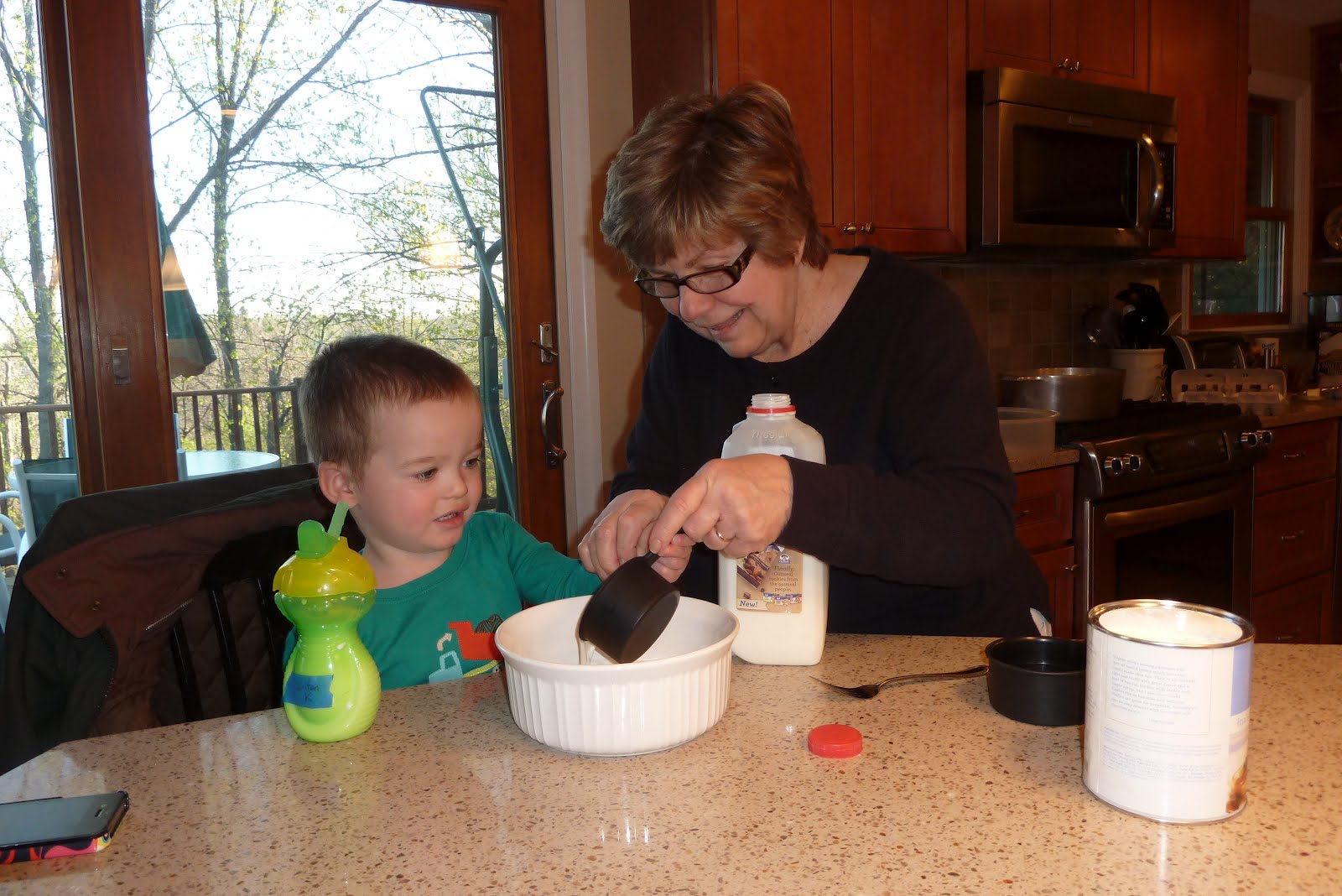 Colton can't say "Grandma." He says, "Ma Ma" instead. He loved spending time with his Grandma & Grandpa in Pittsburgh. And like my fantastic memories of helping my Nonnie cook while standing on a stool next her, I had to capture Colton doing the same with my mom. We made pancakes and Colton poured the batter and stirred the mixture together. Awesome memories in the making.